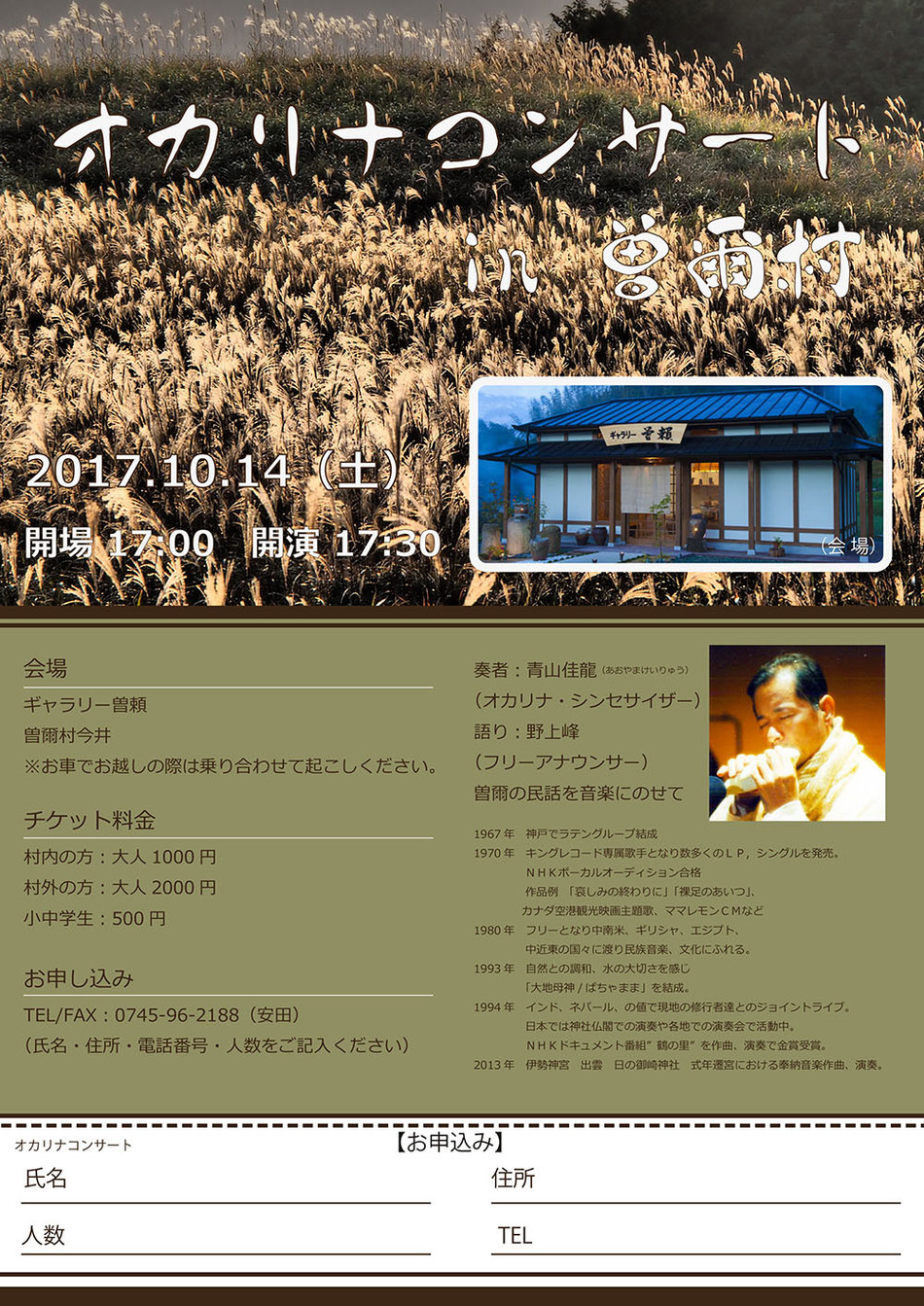 かがり火をたき、素晴らしい雰囲気の元でのコンサートにしたく思っております。どうぞお誘いあわせのの上ご来場くださいますようお願い申しあげます。ギャラリー曽頼 安田